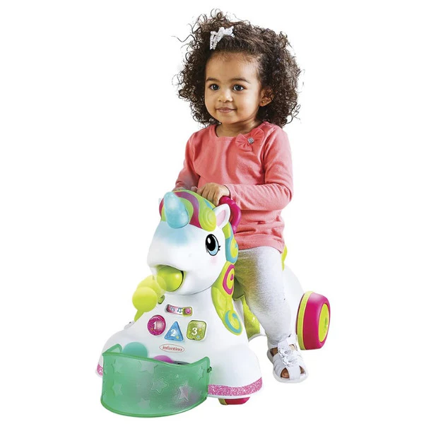 Le trotteur licorne Smilin’ Shimmer d’Infantino est le jouet interactif par excellence pour votre petit ! À partir de 6 mois, les enfants peuvent jouer avec les différents boutons, les lumières, les sons et les chansons tout en restant assis. Lorsque votre enfant a environ 12 mois et qu’il commence à marcher, il peut courir après la licorne, faire sortir des balles de la licorne et les récupérer dans le bac pratique.