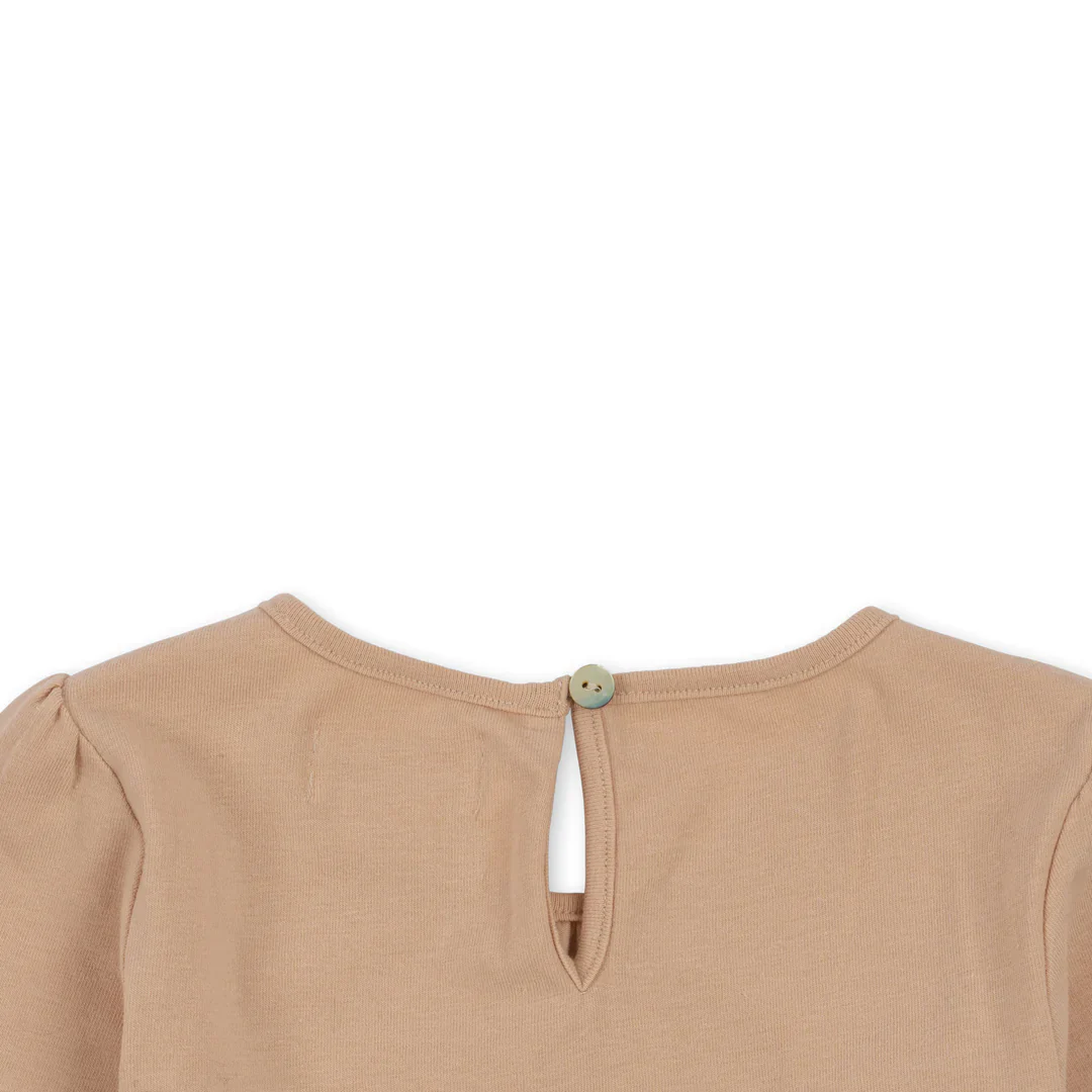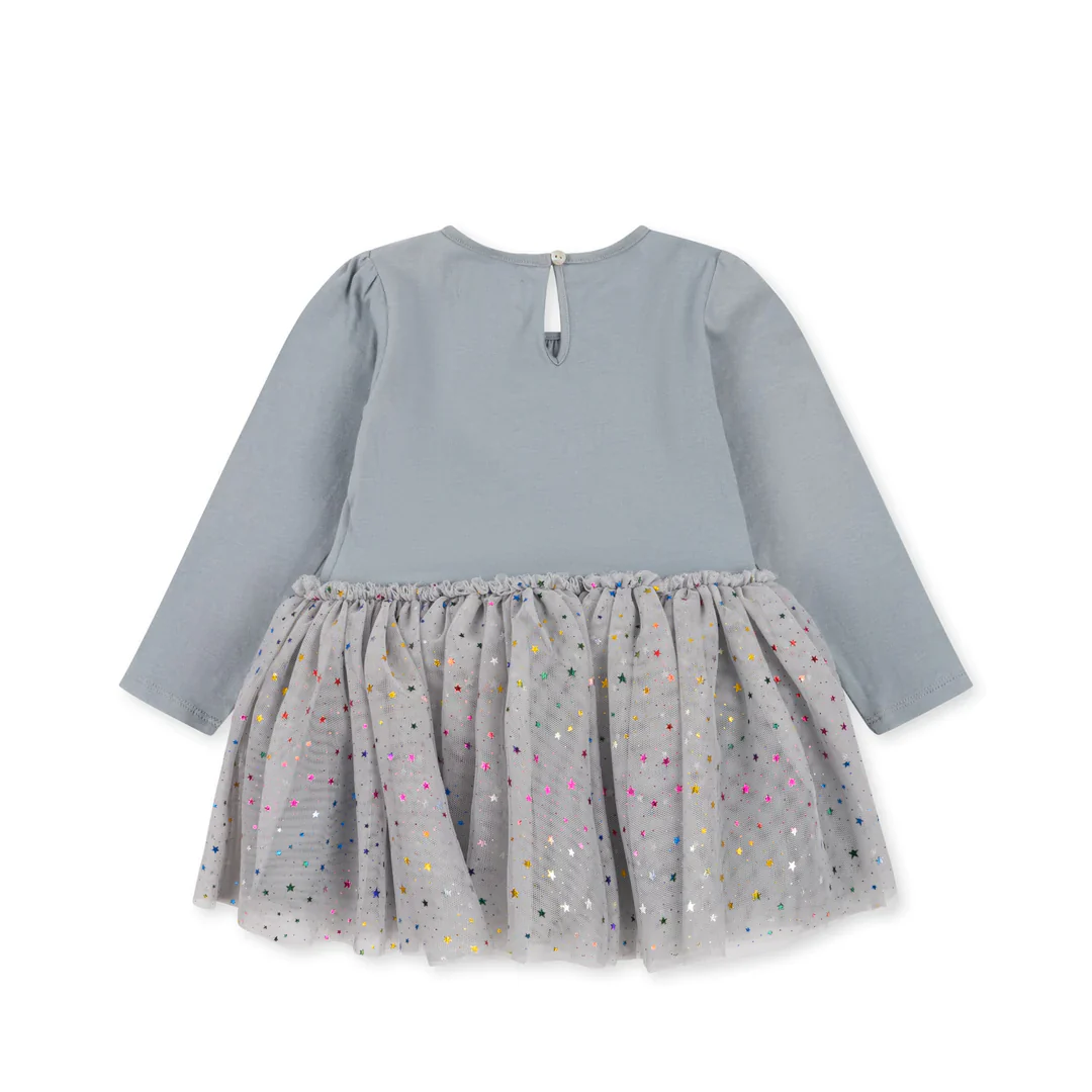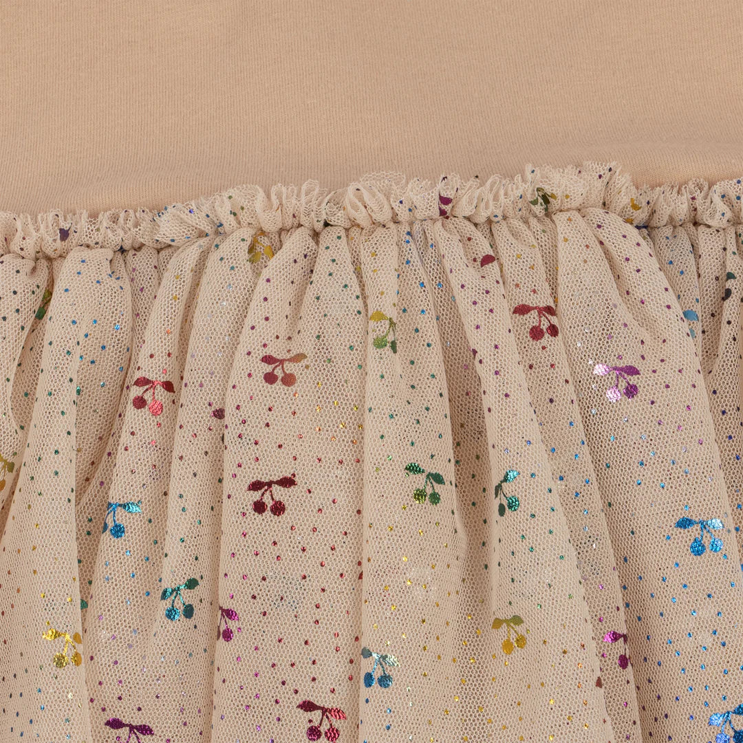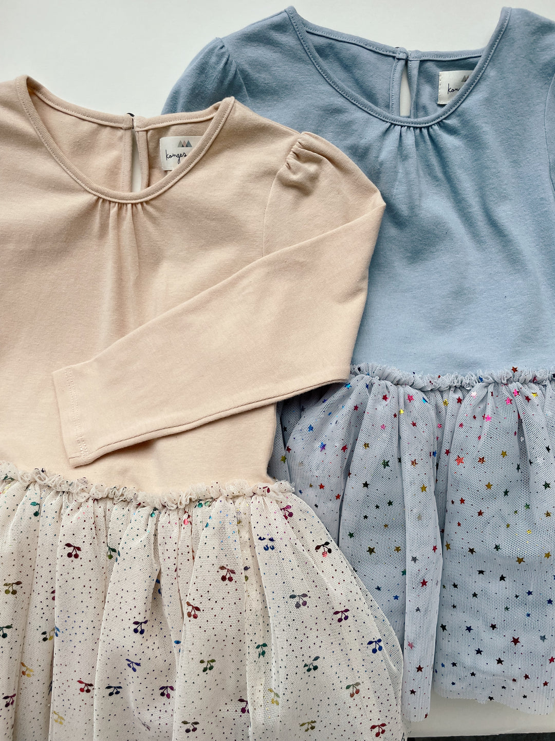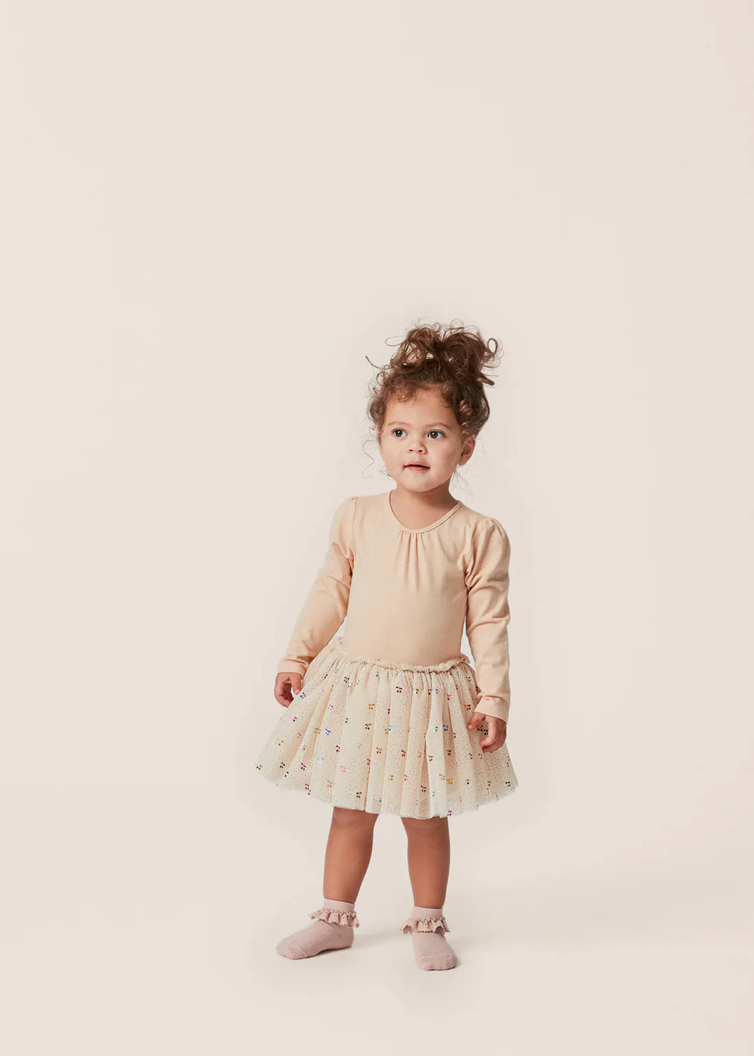 La robe de ballerine Fairy de Konges Slojd est une robe de ballerine douce avec des manches longues, des manches bouffantes et une jupe en tulle à trois couches. Elle se ferme à l’aide d’un bouton perlé dans le dos.
